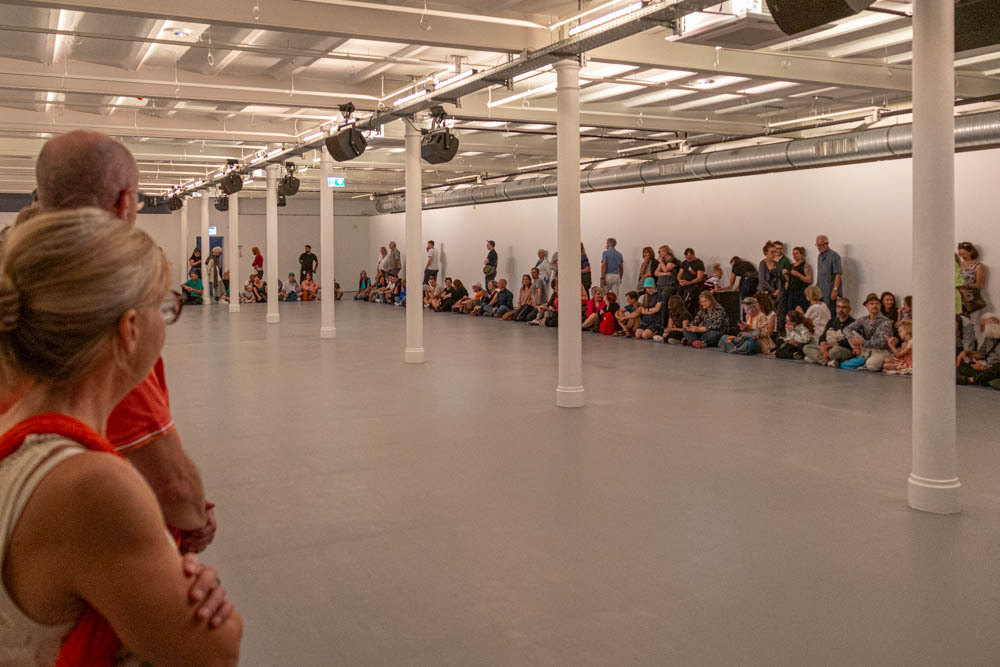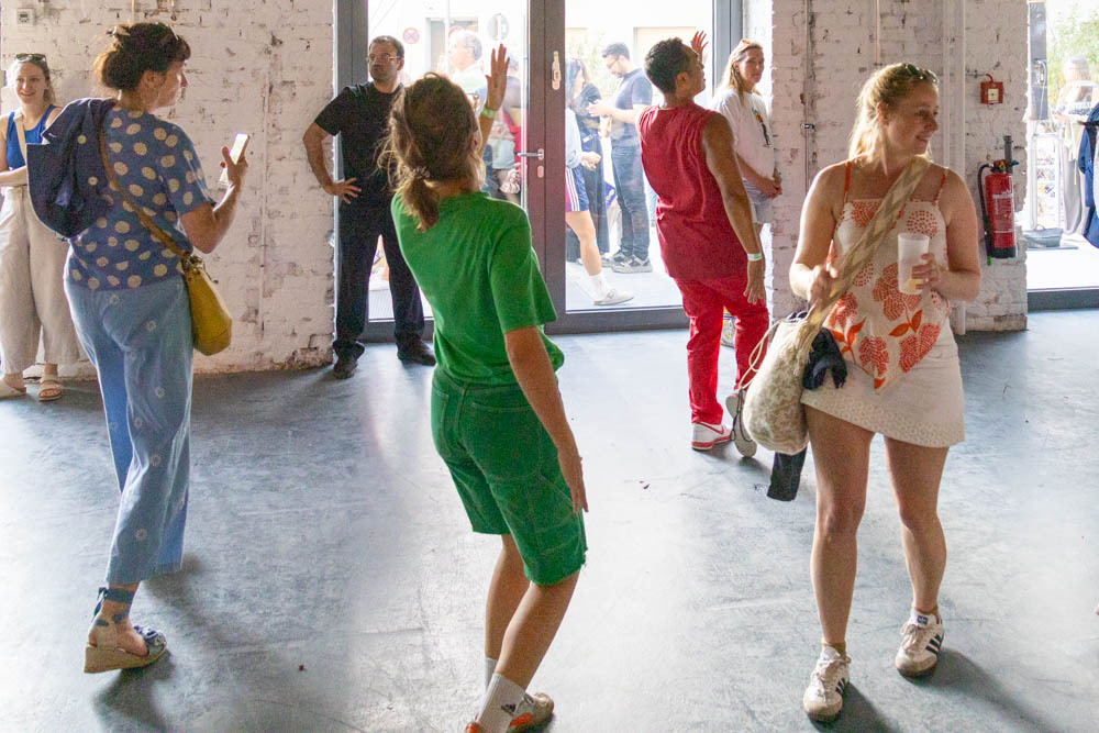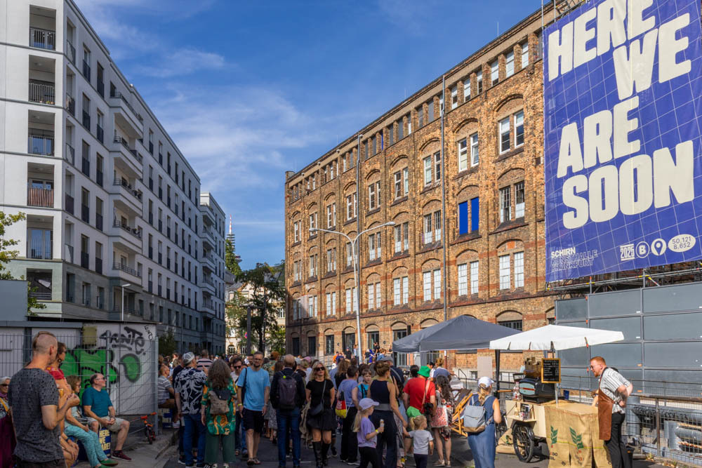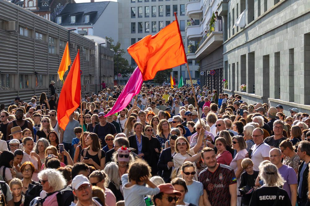 Bereits auf dem Römerberg waren viele Fans der Schirn bereit, den Zug auch tanzend zu begleiten. Bei einem Stopp vor der alten Oper zeigte Sasha Waltz & Guests eine Tanzperformance. Ankunft sollte um 16 Uhr sein. Schließlich erreichte der Zug das Dondorf-Gelände um ca. 18 Uhr, der starken Beteiligung geschuldet.
